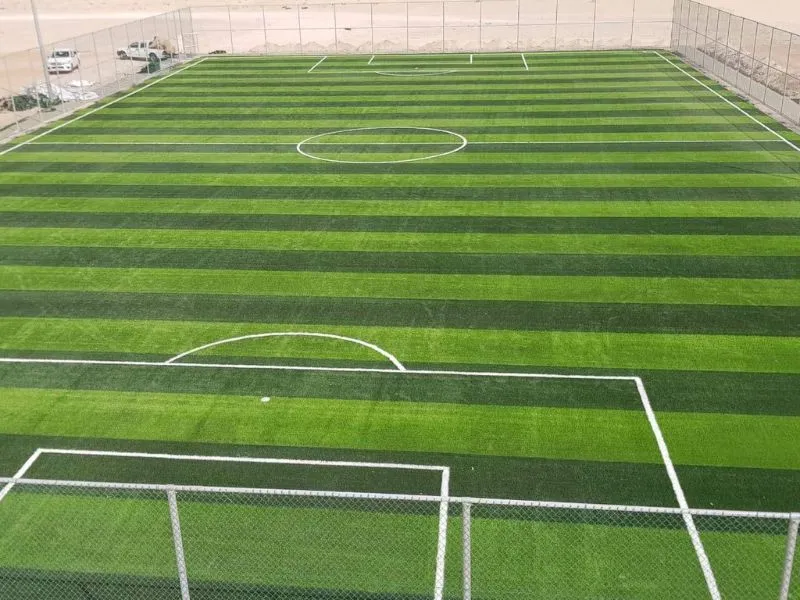 نختار أفضل أنواع العشب الطبيعي أو الصناعي، ونجهز الأرضية بحيث تكون مستوية وصحية، عشان الملعب يكون جاهز للعب مباشرة بدون أي مشاكل.
